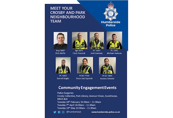 This is a great opportunity to meet local officers and discuss any local issues. All sessions are held between 10:30 and 11:30. Safer Neighbourhoods officers from North Lincolnshire Council will also be present.