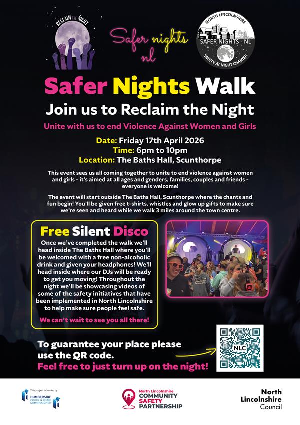 Please see the attached information regarding the Safer Nights Walk on Friday 17th April 2026, starting at 18:00 at The Baths Hall, Doncaster Road, Scunthorpe. We hope you can join us! Thank you. | ||